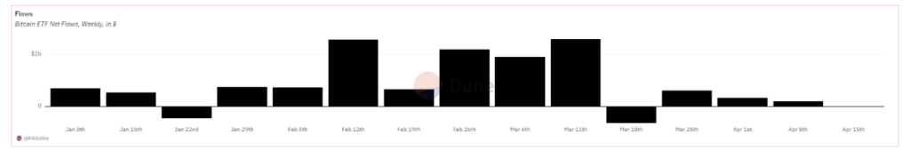 อย่างไรก็ตาม ดูเหมือนว่าระเบิดเวลาดังกล่าวอาจจะนานกว่าที่คาดเอาไว้ หลังจำนวนเงินทุนไหลเข้ารายสัปดาห์ของ Bitcoin ETFs เริ่มชะลอตัวลงตั้งแต่ช่วงกลางเดือนมีนาคมที่ผ่านมา โดยในช่วงสัปดาห์ที่ผ่านมากองทุน ETF มีเงินทุนไหลเข้ารวมแค่ 99 ล้านดอลลาร์เท่านั้น ตามข้อมูลจาก Dune