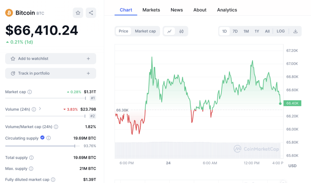 ขณะที่รายงานราคาของ Bitcoin มีการซื้อขายกันอยู่ที่ 66,410 ดอลลาร์ ปรับตัวเพิ่มขึ้น 0.21% ตลอด ในช่วง 24 ชั่วโมงที่ผ่านมา อ้างอิงข้อมูลจาก Coinmarketcap