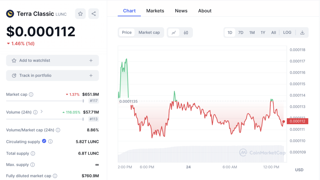 ขณะที่รายงานราคาของเหรียญ Terra Classic (LUNC) มีการซื้อขายกันอยู่ที่ $.0.000112 ลดลง 1.46% ในช่วง 24 ชั่วโมงที่ผ่านมา อ้างอิงข้อมูลจาก Coinmarketcap
