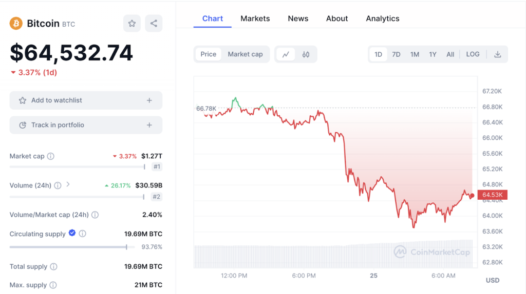 ขณะที่รายงาน Bitcoin มีการซื้อขายกันอยู่ที่ราคา 64,532 ดอลลาร์ ลดลง 3.37% ในช่วง 24 ชั่วโมงที่ผ่านมา อ้างอิงข้อมูลจาก Coinmarketcap