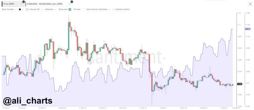 โดยเฉพาะอย่างยิ่ง Ali Martinez นักเทรดและนักวิเคราะห์ on-chain ชื่อดังได้โพสต์ข้อมูลของ Santiment บนแพลตฟอร์ม X เมื่อวันที่ 15 พฤษภาคม Martinez ชี้ให้เห็นการสะสมโทเค็นที่น่าสังเกตจากกระเป๋าเงินของนักลงทุนรายใหญ่ที่มีโทเค็นระหว่าง 1 ล้านถึง 10 ล้าน ในช่วง 15 วันที่ผ่านมา