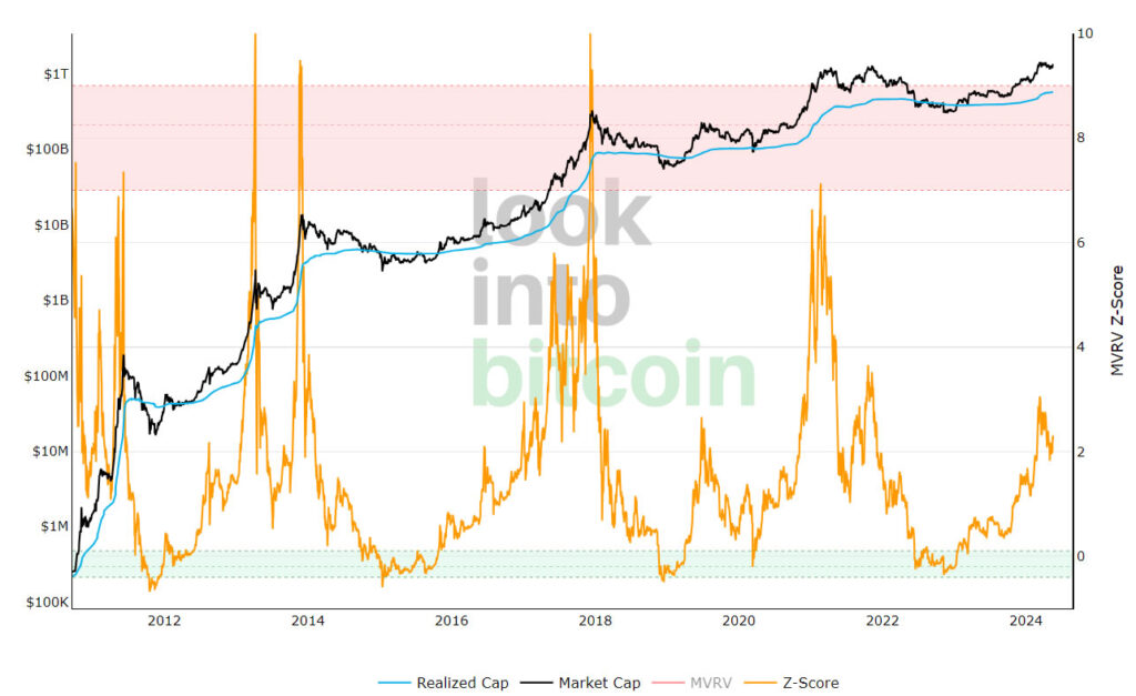 ตัวของ BTC MVRV Z จะเป็นการเปรียบเทียบราคาปัจจุบันในตลาดของ Bitcoin เข้ากับราคาเฉลี่ยที่ผ่านมา ซึ่งคะแนนดังกล่าวมักจะทำจุดสูงสุดที่ 6 ในตลาดขาขึ้น อ้างอิงจากข้อมูลของ LookIntoBitcoin ทว่าในปัจจุบัน Bitcoin นั้นมีค่าเฉลี่ยที่ 3 และยังไม่เคยกลับไปถึง 6 เลยตั้งแต่มีนาคม 2021