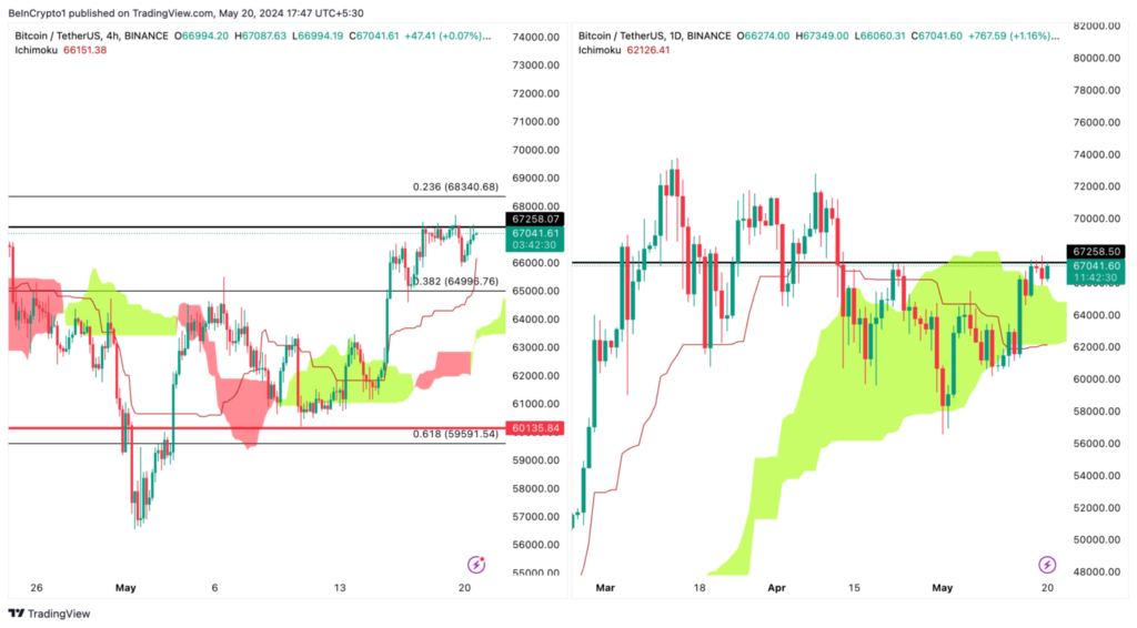 การเคลื่อนไหวของราคา Bitcoin เมื่อเร็ว ๆ นี้ได้ยืนยันข้อมูลเชิงลึกของสัปดาห์ที่แล้ว ราคาทะลุเหนือ 1D Ichimoku Cloud และแตะระดับ 67,500 ดอลลาร์ ปัจจุบันพบแนวต้านระยะสั้นที่ 67,300 ดอลลาร์