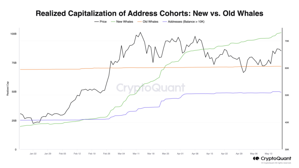 ตั้งแต่เดือนมกราคม มูลค่าตลาดตามราคาทุนสำหรับเจ้ามือรายใหญ่ใหม่เพิ่มขึ้นอย่างต่อเนื่อง ซึ่งบ่งชี้ว่ามีการสะสม BTC อย่างแข็งขันโดยนักลงทุนรายใหญ่รายใหม่ ในทางตรงกันข้าม มูลค่าตลาดตามราคาทุนสำหรับเจ้ามือรายใหญ่เก่ายังคงค่อนข้างคงที่ แสดงให้เห็นว่านักลงทุนระยะยาวยังคงถือ Bitcoin ของพวกเขาอยู่