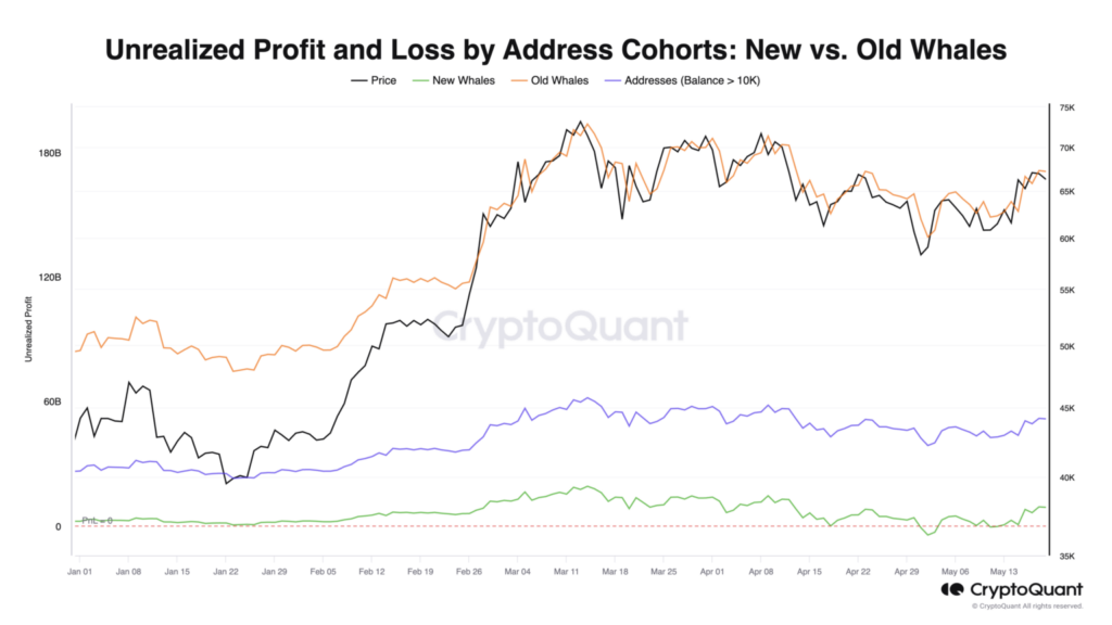 กราฟเหล่านี้แสดงให้เห็นถึงกำไรและขาดทุนที่ยังไม่เกิดขึ้นจริงของกลุ่มที่อยู่ Bitcoin ที่แตกต่างกัน: เจ้ามือรายใหญ่ใหม่ เจ้ามือรายใหญ่เก่า และที่อยู่ที่มี Bitcoin มากกว่า 10,000 BTC