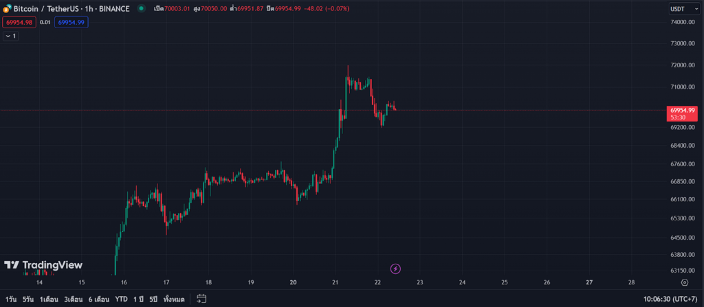ข้อมูลจาก TradingView แสดงให้เห็นว่าราคาของ Bitcoin ในตอนนี้อยู่ที่ประมาณ 69,971 ดอลลาร์ โดยเพิ่มขึ้นมา 13% ในช่วง 1 สัปดาห์ที่ผ่านมา