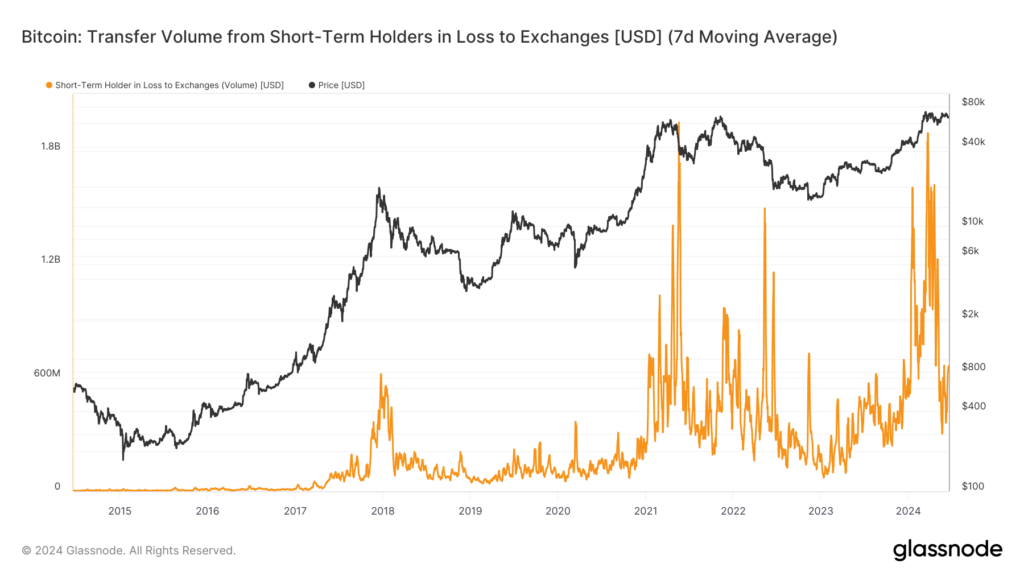 ในหลายครั้งที่ราคาลดลงอย่างรวดเร็ว ทำให้ผู้ถือระยะสั้นเหล่านี้เทขายครั้งใหญ่ โดยมีการเทขายครั้งสำคัญเกิดขึ้นในวันที่ 23 พฤษภาคม เมื่อ Bitcoin มูลค่ากว่า 1 พันล้านดอลลาร์ถูกส่งไปยังกระดานเทรดและขาดทุน ซึ่งเป็นมูลค่าสูงสุดนับตั้งแต่ต้นเดือนมีนาคม กิจกรรมนี้บ่งชี้ถึงรูปแบบของความอ่อนไหวที่เพิ่มขึ้นในหมู่นักลงทุนระยะสั้นต่อการลดลงของราคาอย่างกะทันหัน