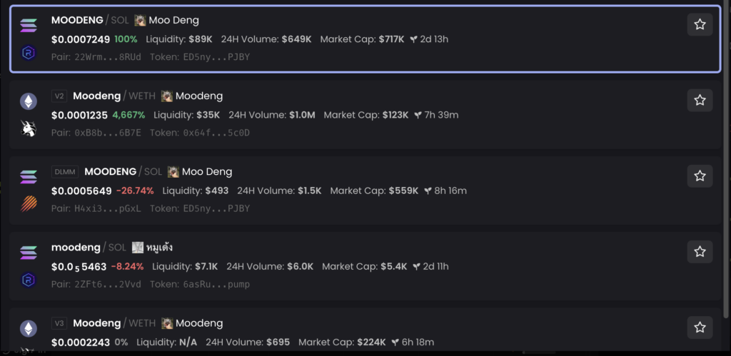 เมื่อเราลองนำคำว่าหมูเด้ง หรือ Moodeng ไปค้นหาใน Dexscreener จะพบว่ามีโปรเจกต์ภาพน้องหมูเด้งขึ้นมาหลายรายการไม่ว่าจะเป็นบน SOL หรือบน ETH