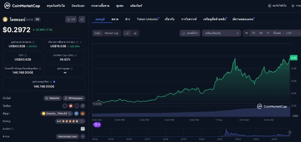 ในขณะที่รายงาน Dogecoin (DOGE) มีการซื้อขายกันอยู่ที่ $0.2972 เพิ่มขึ้น 31.99% ตามข้อมูล CoinMarketCap