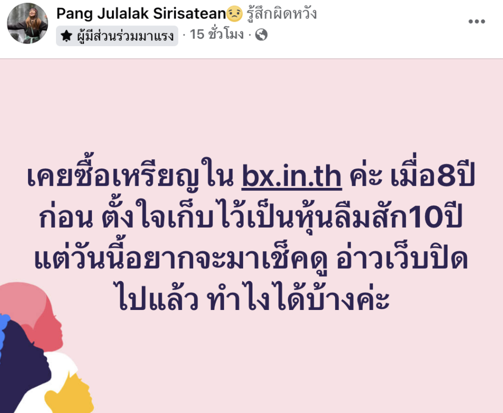 โดยเจ้าของโพสต์เขียนข้อความ กล่าวว่า “ เคยซื้อเหรียญใน bx.in.th ค่ะ เมื่อ 8 ปีก่อน ตั้งใจเก็บไว้เป็นหุ้นลืมสัก10 ปี แต่วันนี้อยากจะมาเช็คดู อ่าวเว็บปิดไปแล้ว ทำไงได้บ้างค่ะ ”