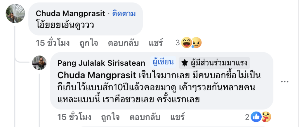 เจ้าของโพสต์ ยังโพสต์ระบายความรู้สึกว่า “เจ็บใจมากเลย มีคนบอกซื้อไม่เป็น ก็เก็บไว้แบบสัก 10 ปีแล้วคอยมาดู เค้าๆรวยกันหลายคนแหละแบบนี้ เราคือซวยเลย ครั้งแรกเลย”