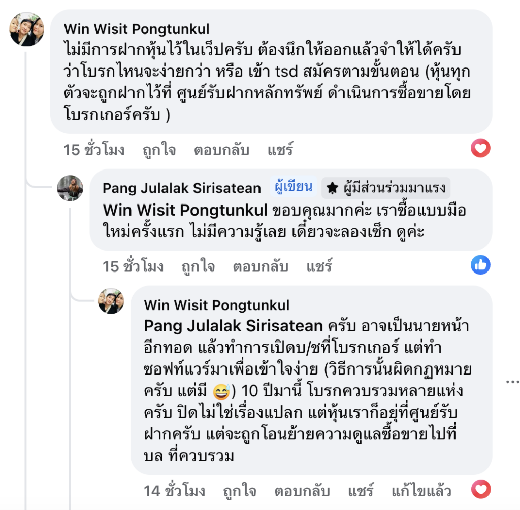 ซึ่งผู้ใช้งานเฟสบุ๊ครายหนึ่ง ได้แนะนำเจ้าของโพสต์ว่า “ไม่มีการฝากหุ้นไว้ในเว็ปครับ ต้องนึกให้ออกแล้วจำให้ได้ครับว่าโบรกไหนจะง่ายกว่า หรือ เข้า tsd สมัครตามขั้นตอน (หุ้นทุกตัวจะถูกฝากไว้ที่ ศูนย์รับฝากหลักทรัพย์ ดำเนินการซื้อขายโดยโบรกเกอร์ครับ )”