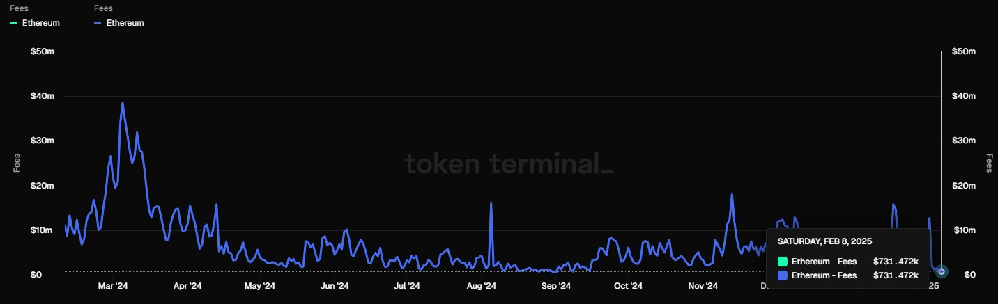 ดูเหมือนว่าค่าธรรมเนียมธุรกรรมรายวันบนเครือข่าย Ethereum จะได้ลดลงต่ำสุดนับตั้งแต่เดือนกันยายน 2024 หลังข้อมูลจาก Token Terminal พบว่า Ethereum ทำรายได้จากค่าธรรมเนียมเพียง 731,472 ดอลลาร์ เมื่อวันที่ 8 กุมภาพันธ์ที่ผ่านมา ซึ่งถือเป็นครั้งแรกในรอบ 5 เดือนที่รายได้รายวันต่ำกว่า 1 ล้านดอลลาร์