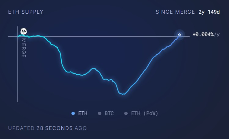 โดยการเข้ามาของ The Merge ช่วยลดอัตราเงินเฟ้อของ Ethereum ด้วยการเปลี่ยนจากระบบ Proof-of-Work (PoW) มาเป็น Proof-of-Stake (PoS) รวมถึงการใช้กลไก London Hard Fork ในปี 2021 ซึ่งเผาผลาญ (burn) ค่าธรรมเนียมบางส่วน อย่างไรก็ตาม การใช้งานที่ลดลงส่งผลให้ปริมาณ ETH ที่ถูกเผาลดลง และการออกเหรียญใหม่แซงหน้าปริมาณที่ถูกทำลาย ทำให้ Ethereum กลับมาเป็นสินทรัพย์ที่มีอัตราเงินเฟ้อ
