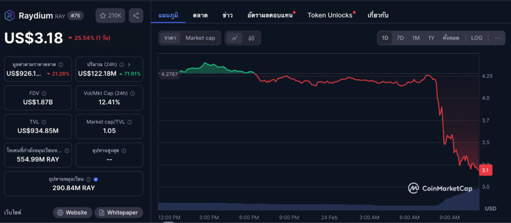 หลังจากข่าวลือถูกเผยแพร่ออกมา ราคาของ Raydium (RAY) มีการร่วงลดลงอย่างรุนแรง จากระดับ $4.10 ลดลงเหลือเพียง $3.18 คิดเป็นการดิ่งลง 25% ภายในเวลา 24 ชั่วโมงที่ผ่านมา ตามข้อมูลจาก CoinMarketCap