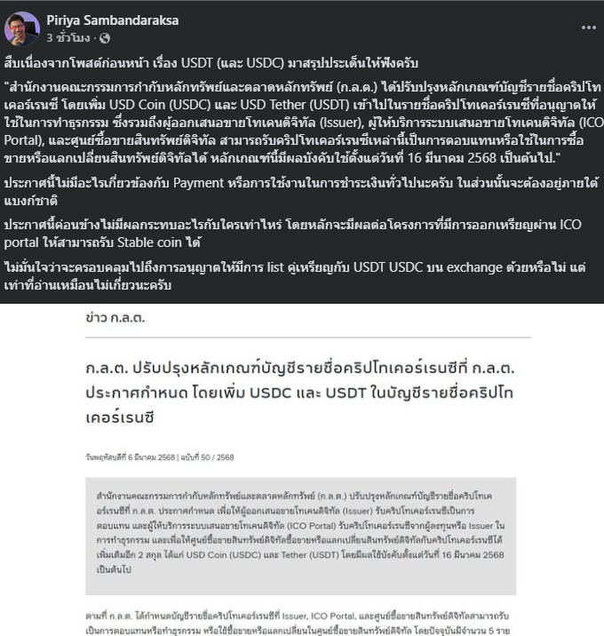 อย่างไรก็ตาม ล่าสุด อาจารย์ ตั๊ม พิริยะ สัมพันธารักษ์ กูรู Bitcoin ชื่อดังของไทยได้ออกมาชี้แจงว่า การประกาศดังกล่าวไม่ได้เกี่ยวข้องกับการใช้งาน USDT และ USDC ในการชำระเงินทั่วไป ซึ่งเรื่องนี้ยังคงอยู่ภายใต้การดูแลของธนาคารแห่งประเทศไทย (แบงค์ชาติ)
