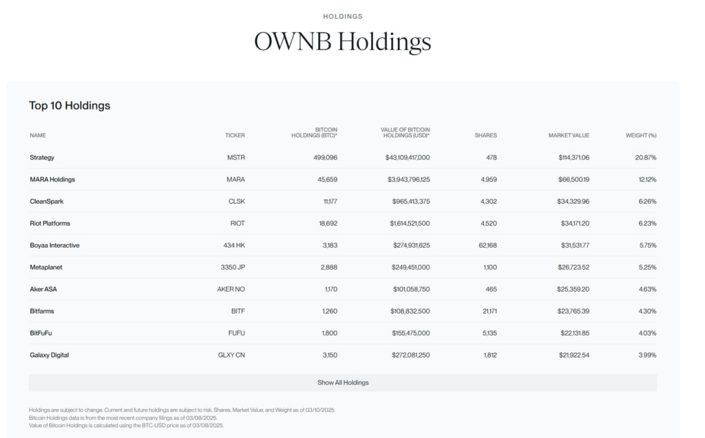 ณ วันที่ 11 มีนาคม กองทุน ETF นี้ ถือหุ้นใหญ่ที่สุดใน MicroStrategy (MSTR) ซึ่งเปรียบเสมือนกองทุนบิตคอยน์ของ Michael Saylor และยังรวมถึงหุ้นของบริษัทเหมืองขุดบิตคอยน์ เช่น MARA Holdings (MARA), CleanSpark (CLSK), และ Riot Platforms (RIOT)