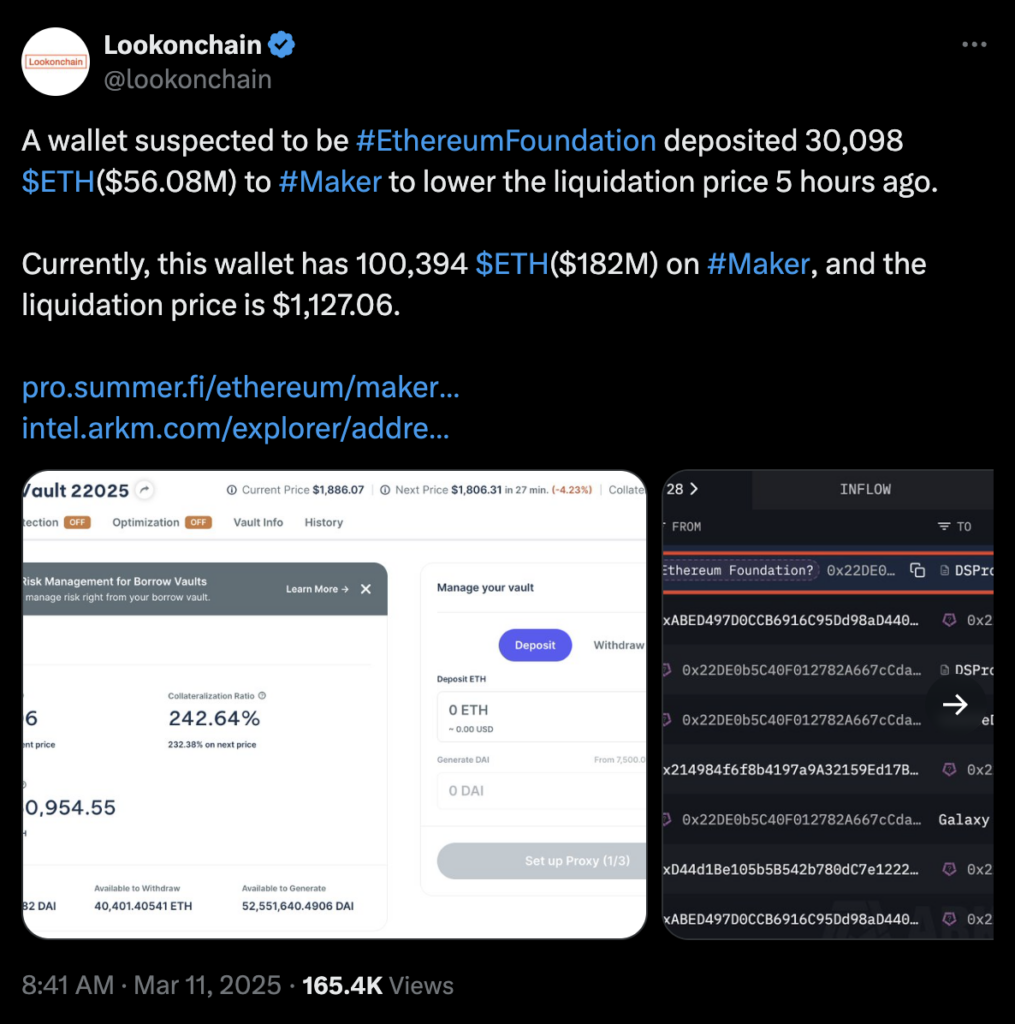 เมื่อวันจันทร์ที่ผ่านมา มีรายงานจาก Lookonchain บริษัทวิเคราะห์บล็อกเชน ระบุว่า พบธุรกรรมการโอน Ethereum จำนวน 30,098 ETH (มูลค่าราว 58 ล้านดอลลาร์) ไปยัง MakerDAO ซึ่งถูกตั้งข้อสังเกตว่า อาจเป็นความพยายามในการกดดันราคาที่ลดลง เพื่อปรับลด liquidation price ของสินทรัพย์ที่อยู่ในระบบ โดยเมื่อราคาลดลงต่ำกว่า “liquidation price” ระบบจะทำการ liquidate หรือขายสินทรัพย์นั้นๆ ทำให้ Ethereum Foundation ต้องออกมาเคลียร์ถึงเรื่องดังกล่าว