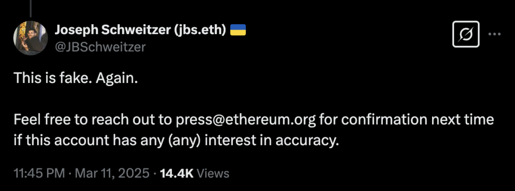 Joseph Schweitzer โฆษกของ Ethereum Foundation ออกมาโพสต์ข้อความลงบนแพลตฟอร์มโซเชียลมีเดีย X ตอบโต้ว่า เป็น “ข่าวปลอม” พร้อมปฏิเสธข้อกล่าวหาดังกล่าวในทันที โดยกล่าวว่า