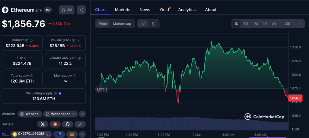ในขณะที่รายงาน ราคา Ethereum กำลังซื้อขายอยู่ที่ 1856.76 ดอลลาร์ ลดลง 0.83% ภายใน 24 ชั่วโมง อ้างอิงข้อมูลจาก coinmarketcap