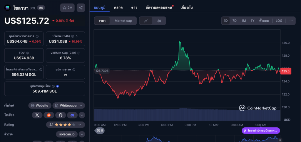 ในขณะที่รายงาน Solana มีการซื้อขายกันอยู่ที่ $125.72 โดยราคามีการเปลี่ยนแปลงเล็กน้อย ในช่วง 24 ชั่วโมงที่ผ่านมา ตามข้อมูลจาก CoinMarketCap