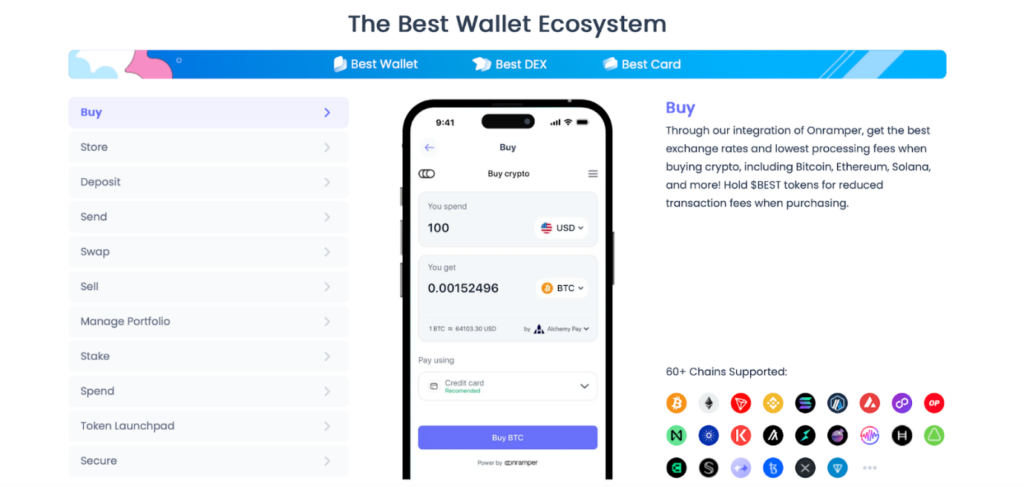 สำหรับผู้ที่จัดการทรัพย์สินในกระเป๋าเงินหลายใบ Best Wallet จะทำให้การนำเข้าและรวมเงินเป็นเรื่องง่าย เนื่องจากรองรับหลายเครือข่าย โดยล่าสุดได้ขยายขอบเขตออกไปนอกเหนือจาก Ethereum ไปจนถึงเครือข่ายอย่าง Bitcoin และเร็ว ๆ นี้ก็กำลังจะรวม Solana เข้ามาอีกด้วย