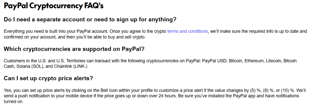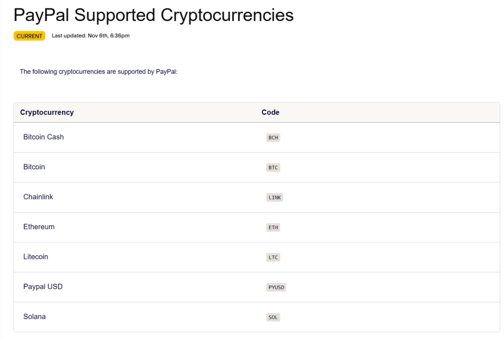 สำหรับผู้ใช้งาน PayPal ในสหรัฐฯ และดินแดนของสหรัฐฯ ตอนนี้สามารถซื้อขาย และถือเหรียญ LINK และ SOL ได้เหมือนกับเหรียญคริปโตตัวอื่นๆ แต่ ณ ตอนนี้ยังไม่สามารถโอนเหรียญเหล่านี้ ไปยังกระเป๋าเงินคริปโตภายนอกได้ โดยเหรียญที่โอนภายนอกได้ในปัจจุบันคือ BTC, ETH, LTC, BCH และ PYUSD ซึ่งสามารถโอนไปยังกระเป๋าเงินรองรับ Ethereum ERC-20 หรือ Solana SPL