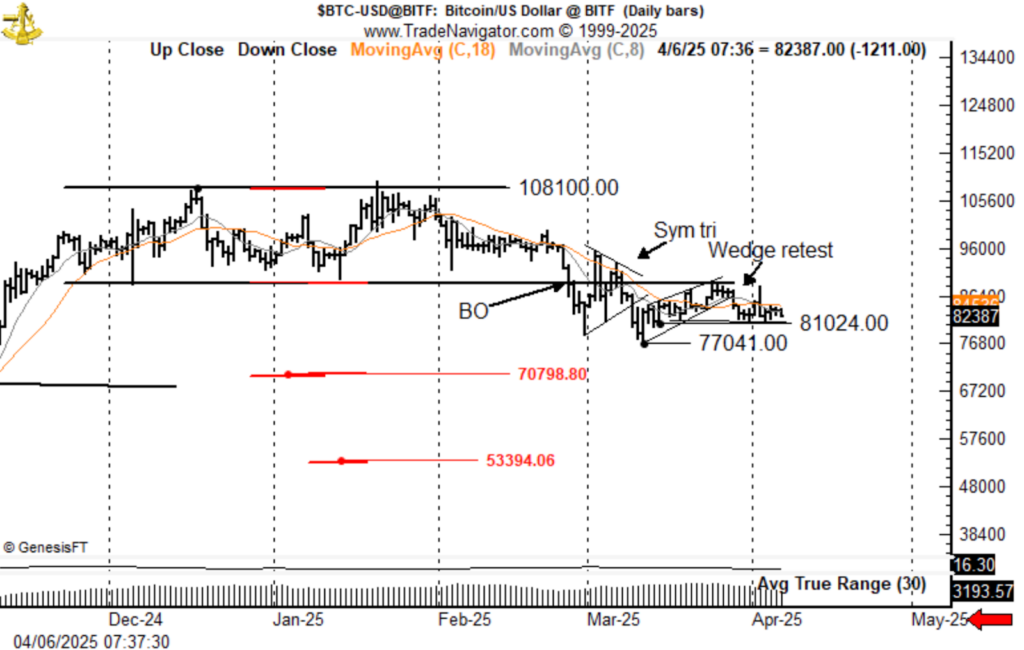ขณะเดียวกัน Peter Brandt นักเทรดสายเทคนิคมากประสบการณ์ ระบุว่า Bitcoin กำลังเคลื่อนไหวอยู่ในรูปแบบ “สามเหลี่ยมสมมาตร” (Symmetrical Triangle) โดยล่าสุดมีการทดสอบแนวรับแบบ Wedge Retest ที่บริเวณราคา $81,024
