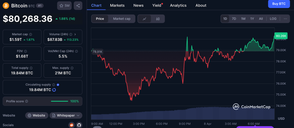 ในขณะที่รายงาน ราคา Bitcoin กำลังซื้อขายอยู่ที่ 80,268 ดอลลาร์ เพิ่มขึ้น 1.86 % ภายใน 24 ชั่วโมง อ้างอิงข้อมูลจาก coinmarketcap
