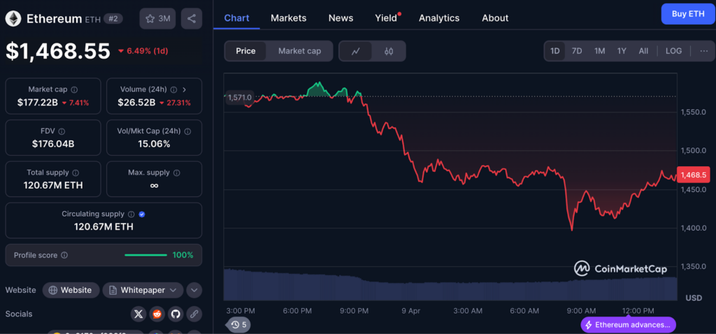 ในขณะที่รายงาน ราคา Ethereum กำลังซื้อขายอยู่ที่ 1468 ดอลลาร์ ลดลง 6.49% ภายใน 24 ชั่วโมง อ้างอิงข้อมูลจาก coinmarketcap