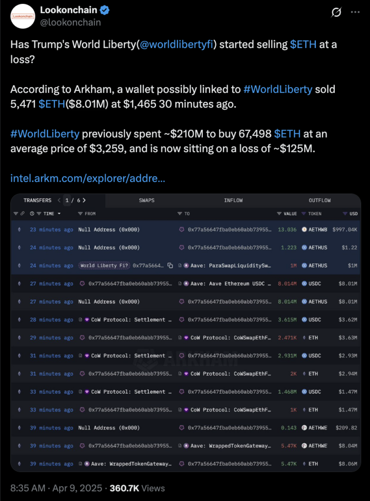 รายงานใหม่จาก Lookonchain ระบุว่า กระเป๋าเงินที่อาจเชื่อมโยงกับ World Liberty Financial ซึ่งเป็นโปรเจกต์ DeFi ที่ได้รับการรับรองโดยตระกูลทรัมป์ อาจขายเหรียญ ETH จำนวน 5,471 ETH คิดเป็นมูลค่าราว 8 ล้านดอลลาร์ ที่ราคาขายเฉลี่ยประมาณ 1,465 ดอลลาร์ต่อเหรียญ ในวันนี้