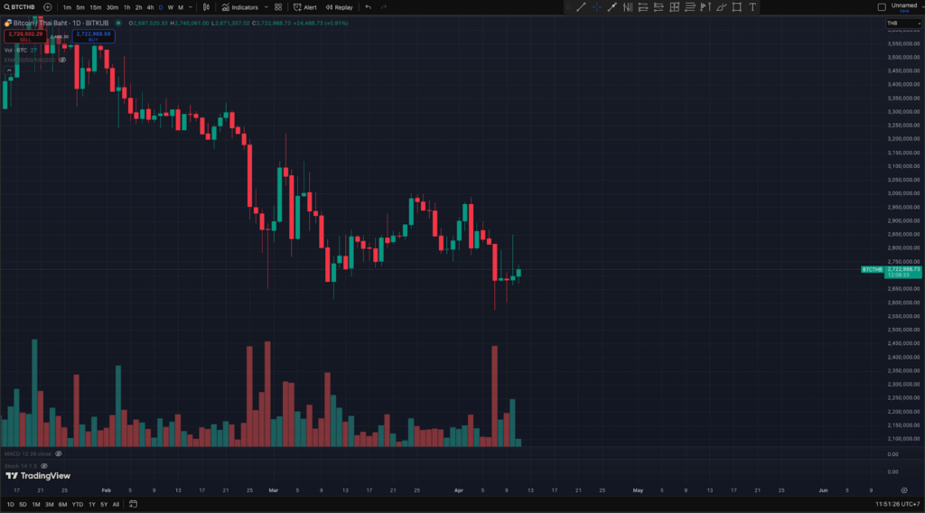 ในขณะที่รายงาน Bitcoin มีการซื้อขายกันอยู่ที่ประมาณ 2.7 ล้านบาท ต่อ 1 BTC เพิ่มขึ้นมาเล็กน้อย 0.98% ในช่วง 24 ชั่วโมงที่ผ่านมา อ้างอิงข้อมูลจาก TradingVeiw