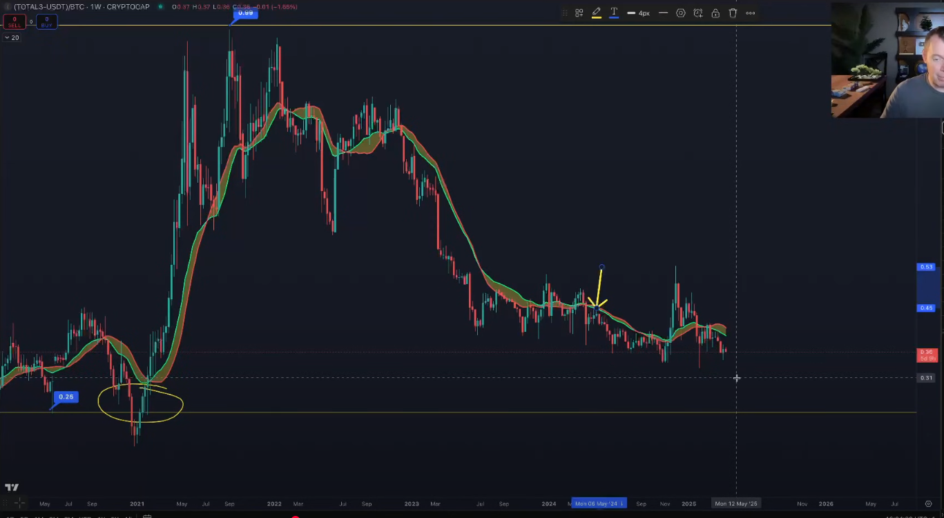 ในวิดีโอกลยุทธ์ล่าสุดที่ Cowen เผยแพร่บน YouTube เขาชี้ว่า มูลค่ารวมของตลาด Altcoin (Total3) เมื่อเทียบกับ Bitcoin กำลังอยู่ในช่วงขาลง และมีแนวโน้มจะดิ่งลงต่ออีกในช่วงสัปดาห์ข้างหน้า คล้ายกับสิ่งที่เกิดขึ้นในช่วงเวลาเดียวกันของปีที่แล้ว