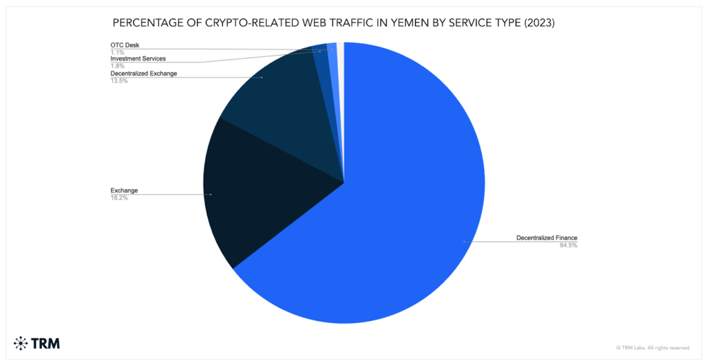 แพลตฟอร์ม DeFi คิดเป็นส่วนใหญ่ของปริมาณการใช้งานเว็บที่เกี่ยวข้องกับสกุลเงินดิจิทัลในเยเมน รองลงมาคือ เว็บเทรดแบบรวมศูนย์ แหล่งที่มา: TRM Labs