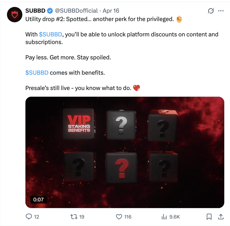 SUBBD คือ โปรเจกต์ AI + คริปโต ที่มีธุรกิจจริงรองรับอยู่แล้ว โดยมีเครือข่ายแฟนคลับมากกว่า 250 ล้านคนทั่วโลก สำหรับอุตสาหกรรมที่ AI และคริปโต ถือเป็น “ส่วนผสมที่ลงตัว” สำหรับกลุ่มเป้าหมายที่กำลังเติบโตอย่างรวดเร็ว