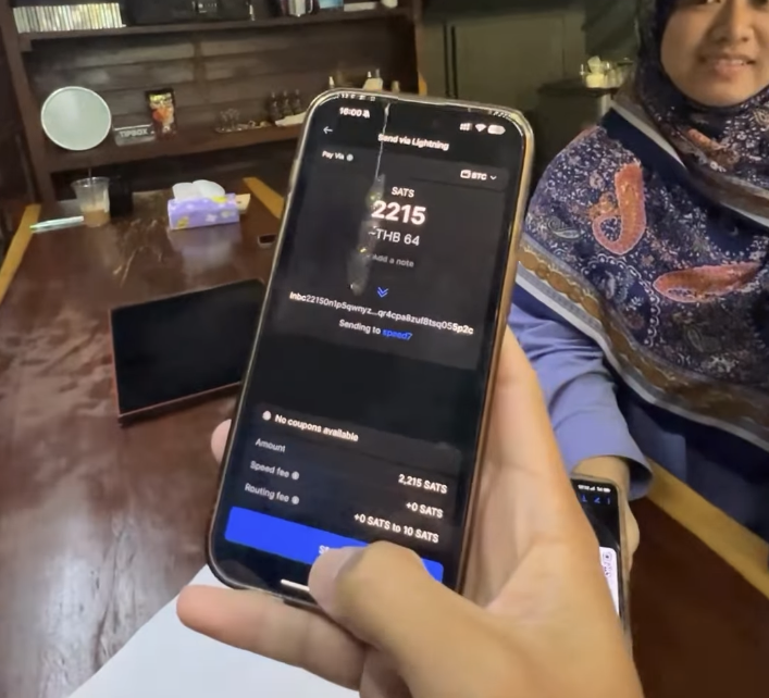 สำหรับค่าเครื่องดื่มแก้วนี้ คิดเป็น Bitcoin จำนวน 2,215 ซาโตชิ (หน่วยย่อยของ BTC) หรือคิดเป็นเงินไทยประมาณ 64 บาท หลังจากนั้นก็กดยืนยันการจ่ายเงิน เพียงแค่พริบตาเดียว ไม่ถึง 2 วินาที ยอดเงินก็ถูกส่งไปยังร้านค้าเรียบร้อย