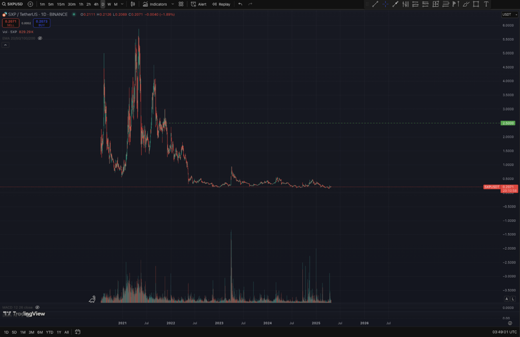 งั้นมาดูต่อกัน ข้อสองคือ ลองเพิ่มเงินที่ยอมเสียได้เข้าไปอีกประมาณ 3,000 – 5,000 บาท หรือถ้าแบบบ้าๆ หน่อยก็ 10,000 บาท โดยพี่ศรีเปรียบเทียบว่าเหมือนกับการเล่นหวย ซึ่งพี่ศรีก็ได้ดูกราฟ SXP แล้วบอกว่า ปกติเขาก็จะพยายามหากราฟทรงนี้ คือกราฟที่มีลักษณะมีการร่วงลงอย่างหนัก แต่ยังมีแรงกระตุกของขึ้นมาตลอดทาง รอวันที่ Market Maker จะกลับมาดันราคาอีกครั้ง