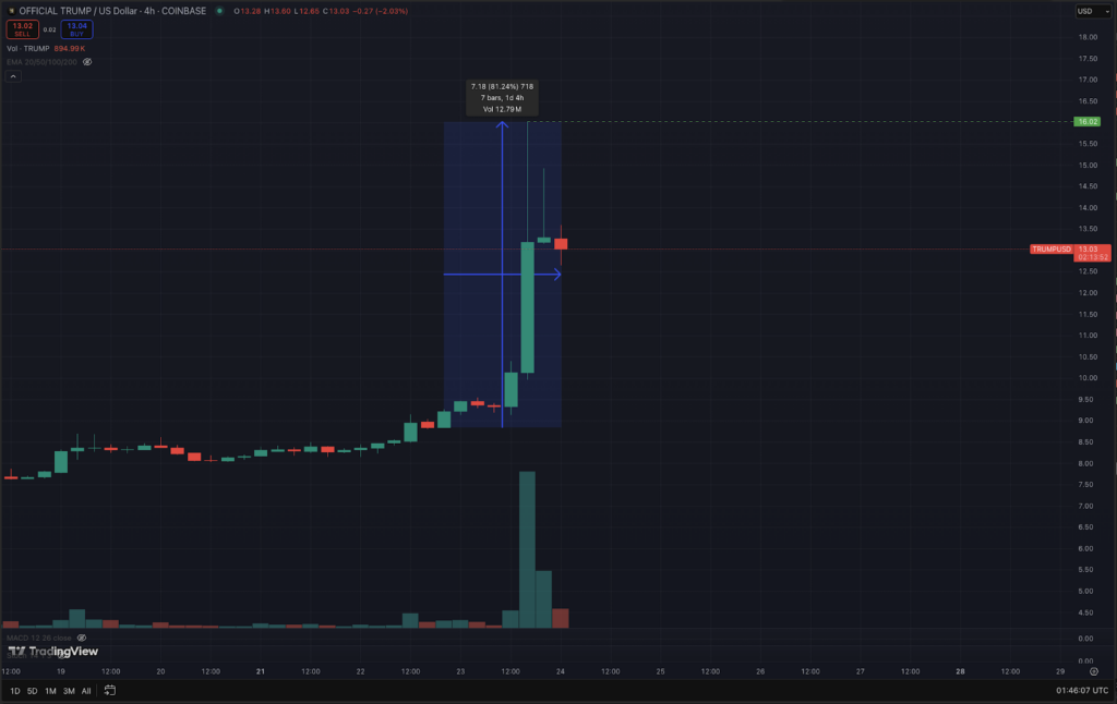 เหรียญมีมอย่างเป็นทางการของประธานาธิบดี “โดนัลด์ ทรัมป์” พุ่งขึ้นกว่า 80% โดยราคา Official Trump ($TRUMP) ได้ขยับขึ้นจากระดับราคาประมาณ $9.00 ทำจุดสูงสุดที่ $16.00 ก่อนที่จะปรับตัวลงมาอยู่แถวระดับ $13.03 บนกระดานเทรด Coinbase