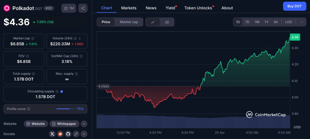 ราคาเหรียญ DOT ก็ยังคงแสดงความแข็งแกร่งอย่างต่อเนื่อง แม้จะมีข่าวเลื่อนการตัดสินอนุมัติกองทุน ETF จาก SEC โดยขณะที่รายงาน ราคา DOT กำลังซื้อขายอยู่ที่ 4.36 ดอลลาร์ เพิ่มขึ้น 7.29% ภายใน 24 ชั่วโมงที่ผ่านมา อ้างอิงข้อมูลจาก coinmarketcap