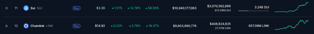 โดยมูลค่าตลาดของ Chainlink อยู่ที่ประมาณ 9,803 ล้านดอลลาร์ ในขณะที่มูลค่าตลาดของ Sui พุ่งทะลุระดับ 1 หมื่นล้านดอลลาร์ ขยับขึ้นมาอยู่ที่ประมาณ 10,940 ล้านดอลลาร์