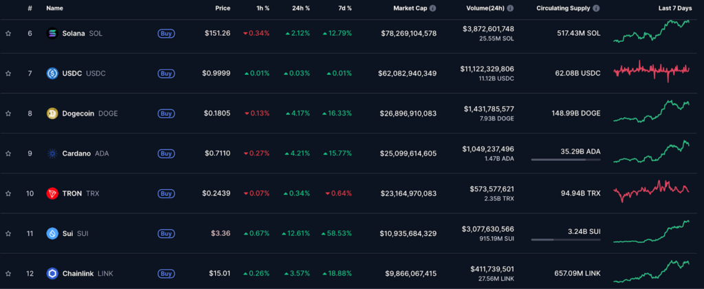 Sui เครือข่ายบล็อกเชนเลเยอร์ 1 กลายเป็นกระแสฮือฮา หลังจากราคาพุ่งขึ้นกว่า 58.59 % ในช่วง 7 วันที่ผ่านมา จนสามารถแซงหน้า Chainlink ได้ในแง่มูลค่าตลาด และกลายเป็นเหรียญคริปโทฯที่มีมูลค่าตลาดใหญ่เป็นอันดับที่ 11 ของโลก