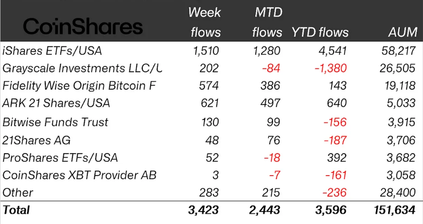 เงินลงทุนใหม่นี้กระจายไปยังผู้ออกกองทุนรายใหญ่ในสหรัฐฯ และยุโรป โดย iShares ETF ของ BlackRock ครองแชมป์ด้วยเงินไหลเข้า 1.5 พันล้านดอลลาร์ ตามมาด้วย ARK ที่ 621 ล้านดอลลาร์ และ Fidelity ที่ 574 ล้านดอลลาร์ ขณะที่ Grayscale, ProShares และ CoinShares ยังคงเผชิญกับเงินไหลออกตั้งแต่ต้นเดือนเมษายน