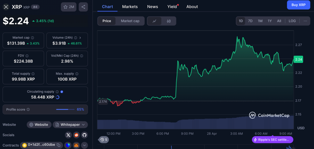 ในขณะที่รายงาน ราคา XRP ซื้อขายอยู่ที่ 2.24 ดอลลาร์ มูลค่าตลาดรวมอยู่ที่ประมาณ 131,398 ล้านดอลลาร์ ครองสัดส่วน 4.48% ของตลาดคริปโตทั้งหมด โดยปริมาณการซื้อขายใน 24 ชั่วโมง เพิ่มขึ้น 46.70% อยู่ที่ 3,913 ล้านดอลลาร์