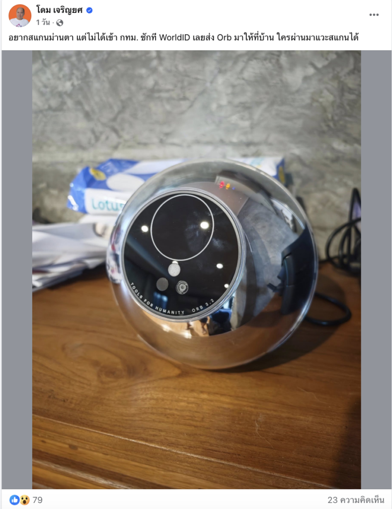“อยากสแกนม่านตา แต่ไม่ได้เข้า กทม. ซักที WorldID เลยส่ง Orb มาให้ที่บ้าน ใครผ่านมาแวะสแกนได้”