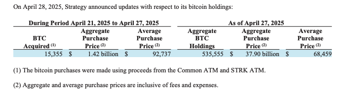 โดยในระหว่างวันที่ 21-27 เมษายน บริษัทได้เข้าซื้อ Bitcoin จำนวน 15,355 เหรียญ รวมเป็นเงินกว่า 1.42 พันล้านดอลลาร์ ที่ราคาเฉลี่ยเหรียญละ 92,737 ดอลลาร์ ทำให้ยอดการถือครองรวมของบริษัทเพิ่มขึ้นราว 3% แตะระดับ 535,555 BTC คิดเป็นมูลค่ากว่า 50 พันล้านดอลลาร์