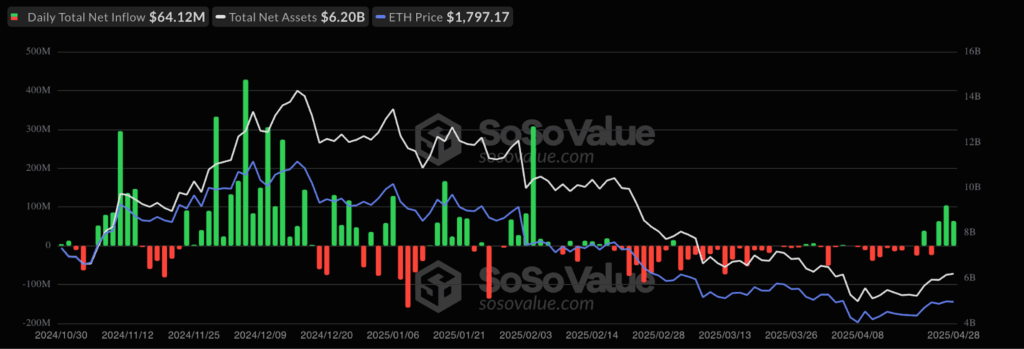 โดยหนึ่งในปัจจัยสำคัญที่ผลักดันราคาคือความต้องการจากนักลงทุนสถาบันที่กลับมาอีกครั้ง โดยเฉพาะการไหลเข้าสู่ Ethereum ETF แบบ spot ที่สูงถึง 64.1 ล้านดอลลาร์ในวันที่ 28 เมษายน ตามหลังสัปดาห์ที่มียอดไหลเข้าสูงถึง 151.7 ล้านดอลลาร์ ซึ่งเป็นระดับสูงสุดนับตั้งแต่กุมภาพันธ์ 2025 นอกจากนี้