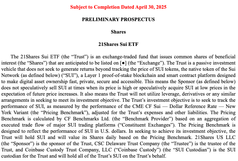 โดยกองทุนใหม่นี้ใช้ชื่อว่า “21Shares Sui ETF” ซึ่งจะมีการออกหุ้นสามัญที่สะท้อนประสิทธิภาพของราคา SUI ที่ถือครองโดยบริษัทในเครือของ 21Shares ในสหรัฐอเมริกา ตัวเอกสารยื่นจดทะเบียน Form S-1 มีความยาวถึง 128 หน้า