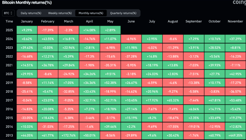 ทั้งนี้ ในส่วนของตลาด Bitcoin ก็อาจได้รับผลกระทบจากวลีดังกล่าวเช่นกัน ทำให้นักลงทุนบางรายเกิดความไม่มั่นใจว่าเดือนพฤษภาคมนี้ Bitcoin จะยังน่าจับตาอยู่หรือไม่ แต่หากย้อนดูข้อมูลย้อนหลังตลอด 12 ปีที่ผ่านมา จะพบว่าเดือนพฤษภาคมไม่ใช่ช่วงที่ Bitcoin ทำผลงานแย่เสมอไป บางปีราคายังพุ่งแรงสวนกระแสตลาดหุ้นอีกด้วย