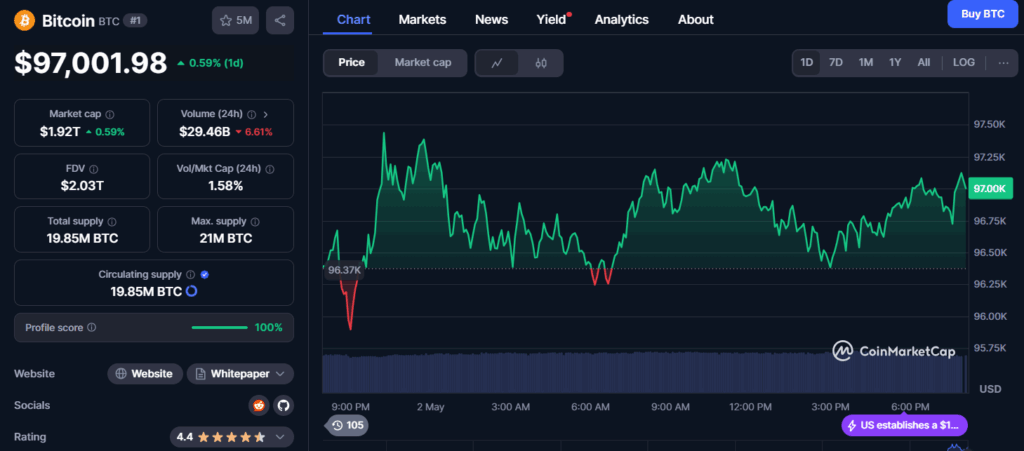 ดูเหมือนว่าตลาดคริปโตจะยังคงคึกคักอย่างต่อเนื่อง หลังล่าสุดราคา Bitcoin ได้พุ่งขึ้นไปแตะที่ 97,000 ดอลลาร์แล้ว โดยราคาเหรียญเพิ่มขึ้น 0.59% ในช่วง 1 วันที่ผ่านมา และ 2.77% ในช่วง 7 วันที่ผ่านมาตามข้อมูลจาก CoinmarketCap