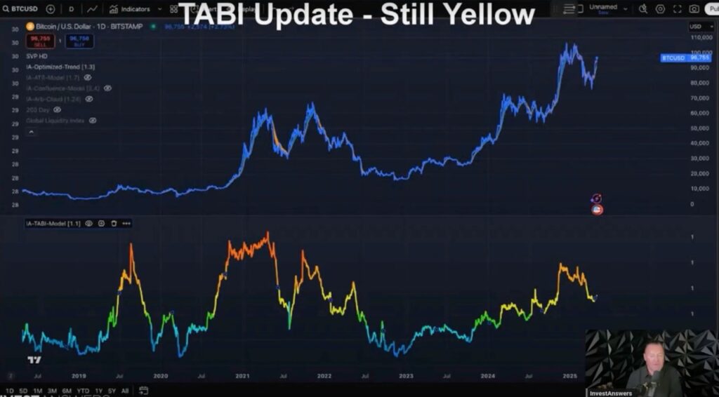 สุดท้าย เขาบอกว่า Top and Bottom Indicator (TABI) ของเขา ซึ่งใช้ตัวชี้วัดหลายตัวเพื่อคาดการณ์จุดสูงสุดและจุดต่ำสุดของตลาด บ่งชี้ว่า Bitcoin อาจพุ่งสูงสูงขึ้น